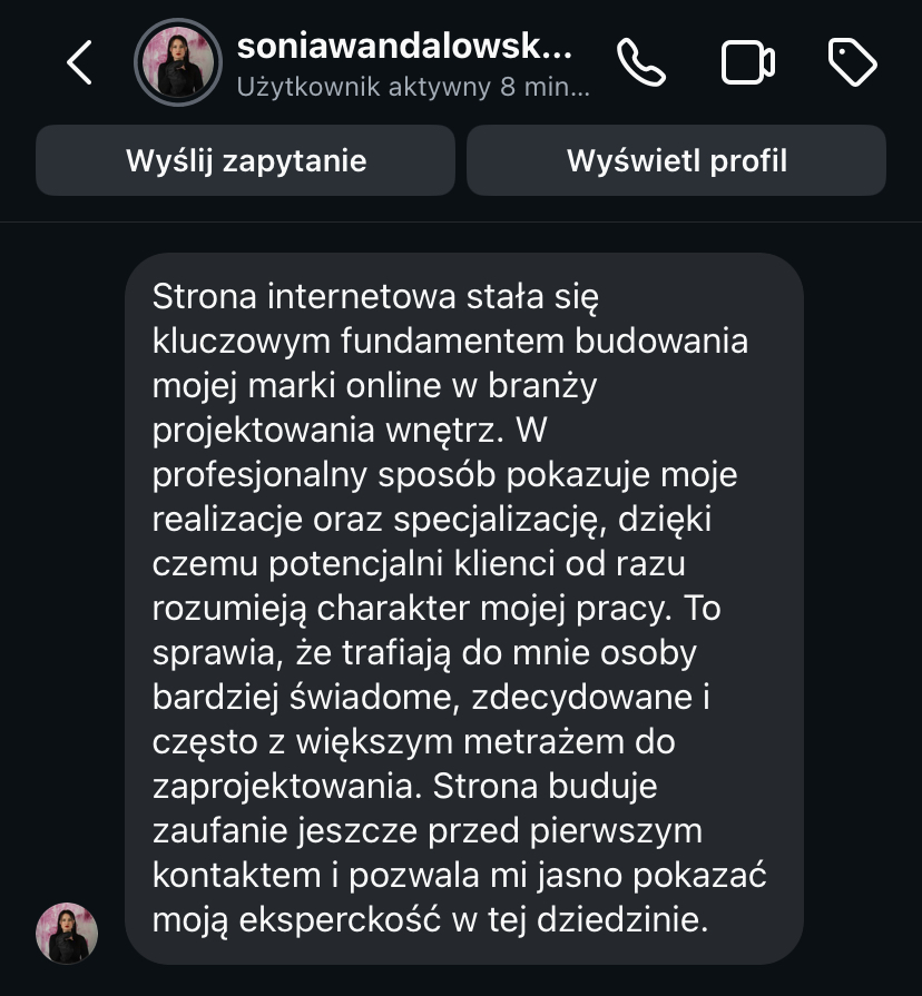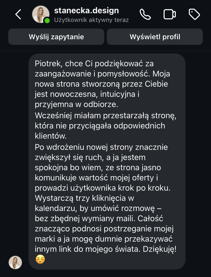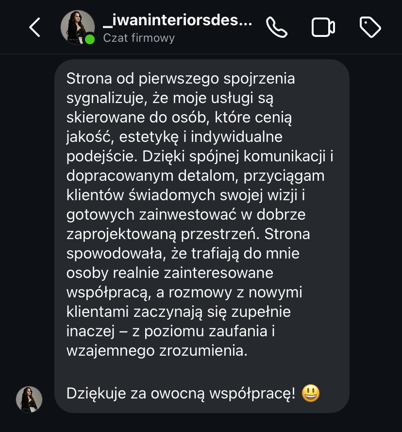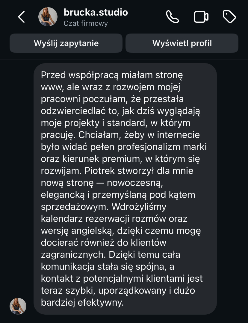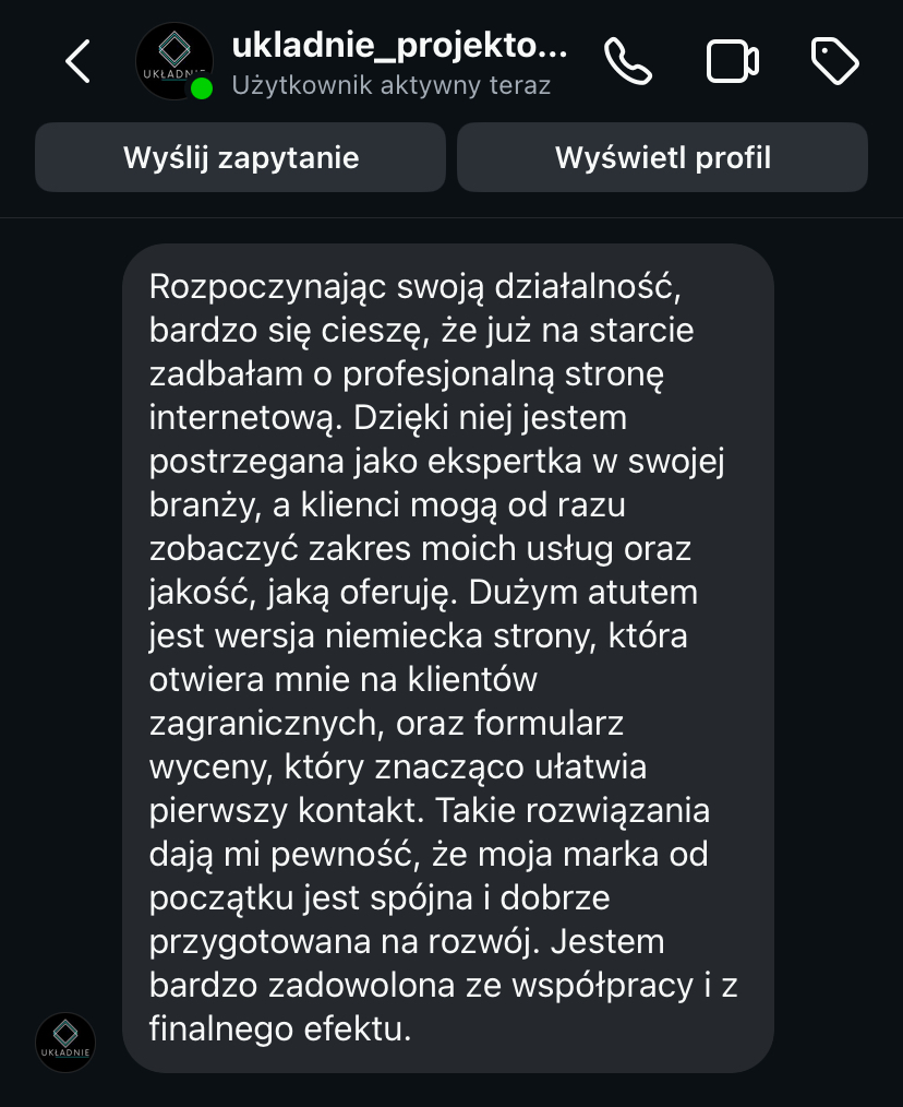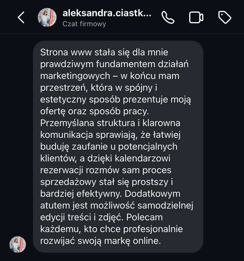 „Strona www daje mi spokój, bo wiem, że moja marka jest widoczna i działa 24h na dobę.”