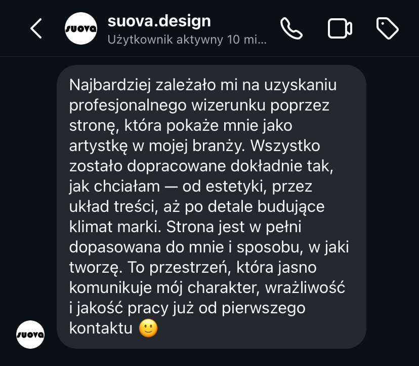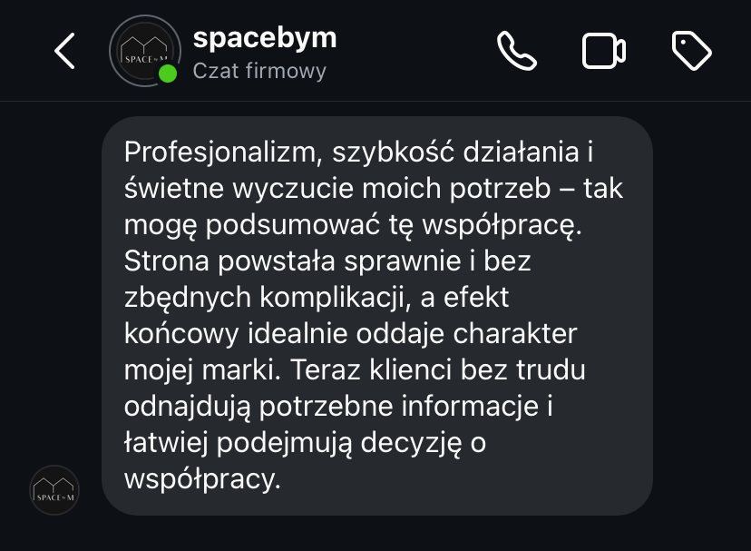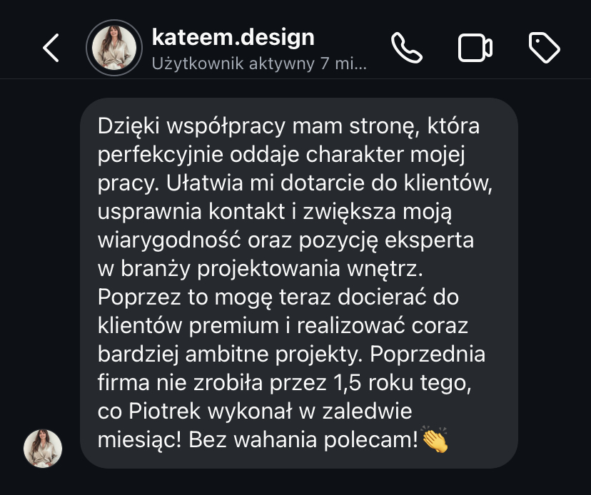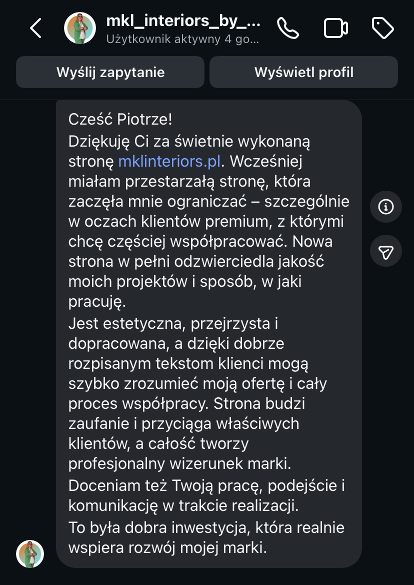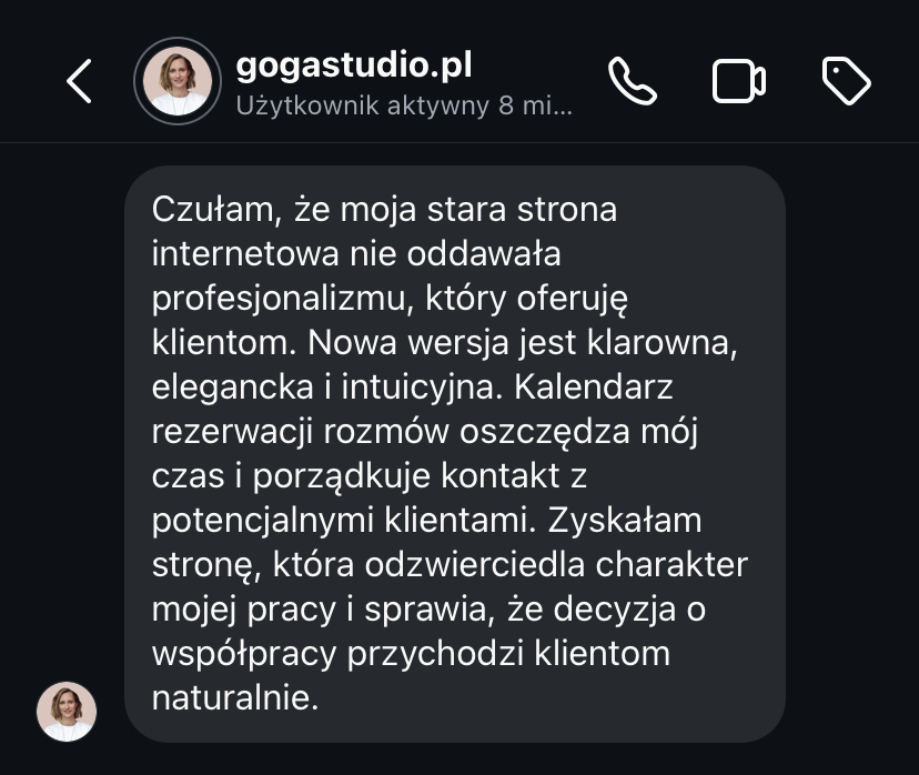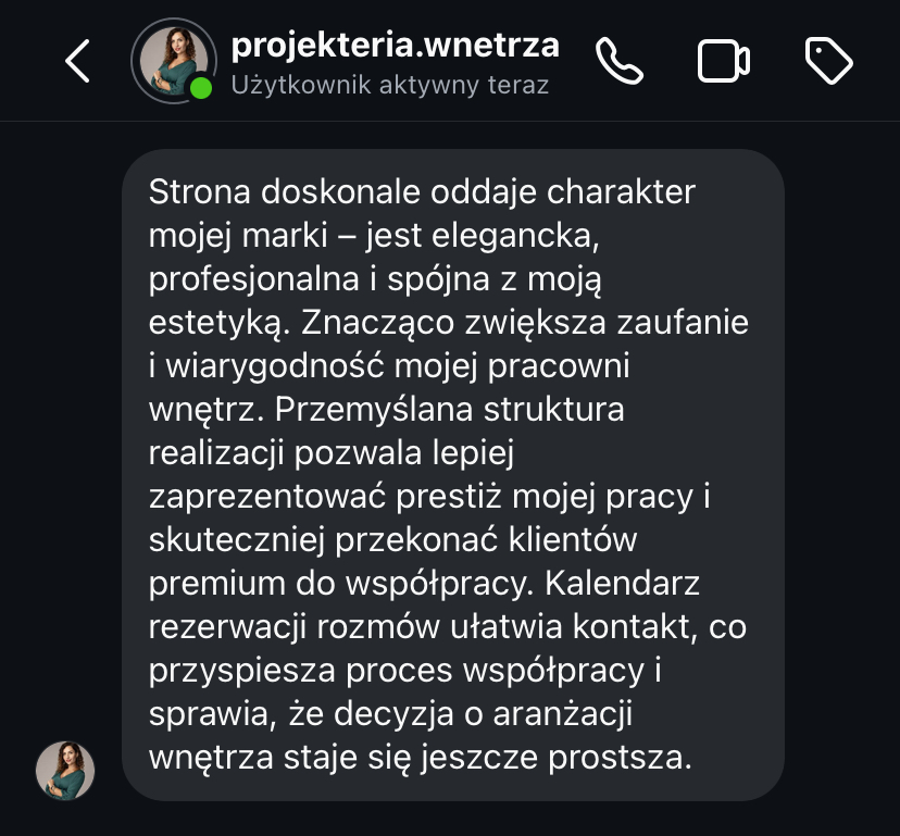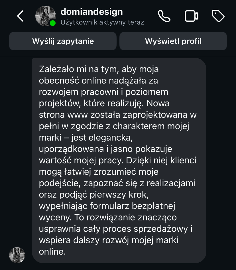 „Strona www daje mi spokój, bo wiem, że moja marka jest widoczna i działa 24h na dobę.”