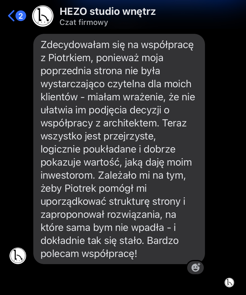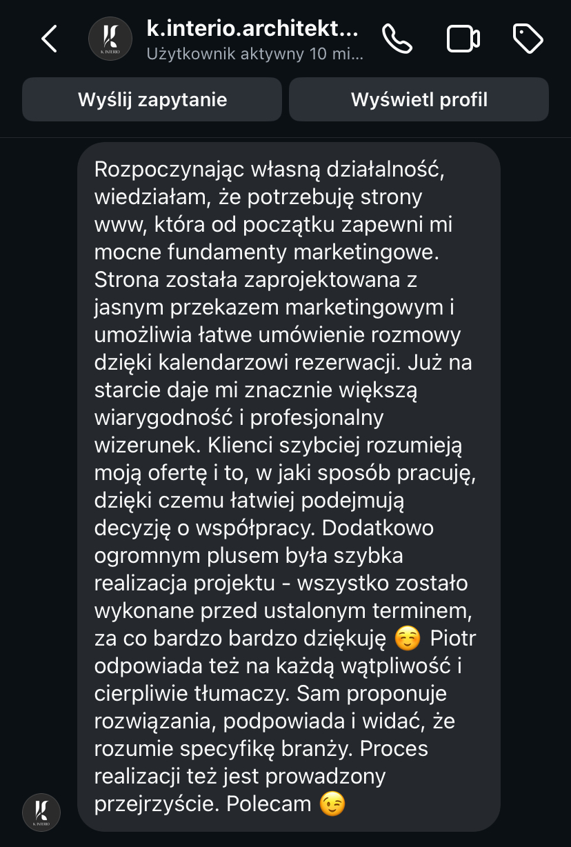 „Zauważyłam, że Piotrek specjalizuję się w stronach dla architektów i projektantów wnętrz i będzie odpowiednią osobą do tego, żeby dobrać najlepsze rozwiązania.